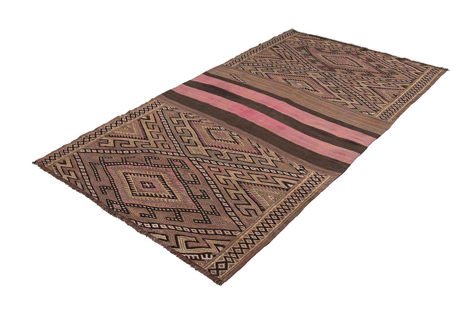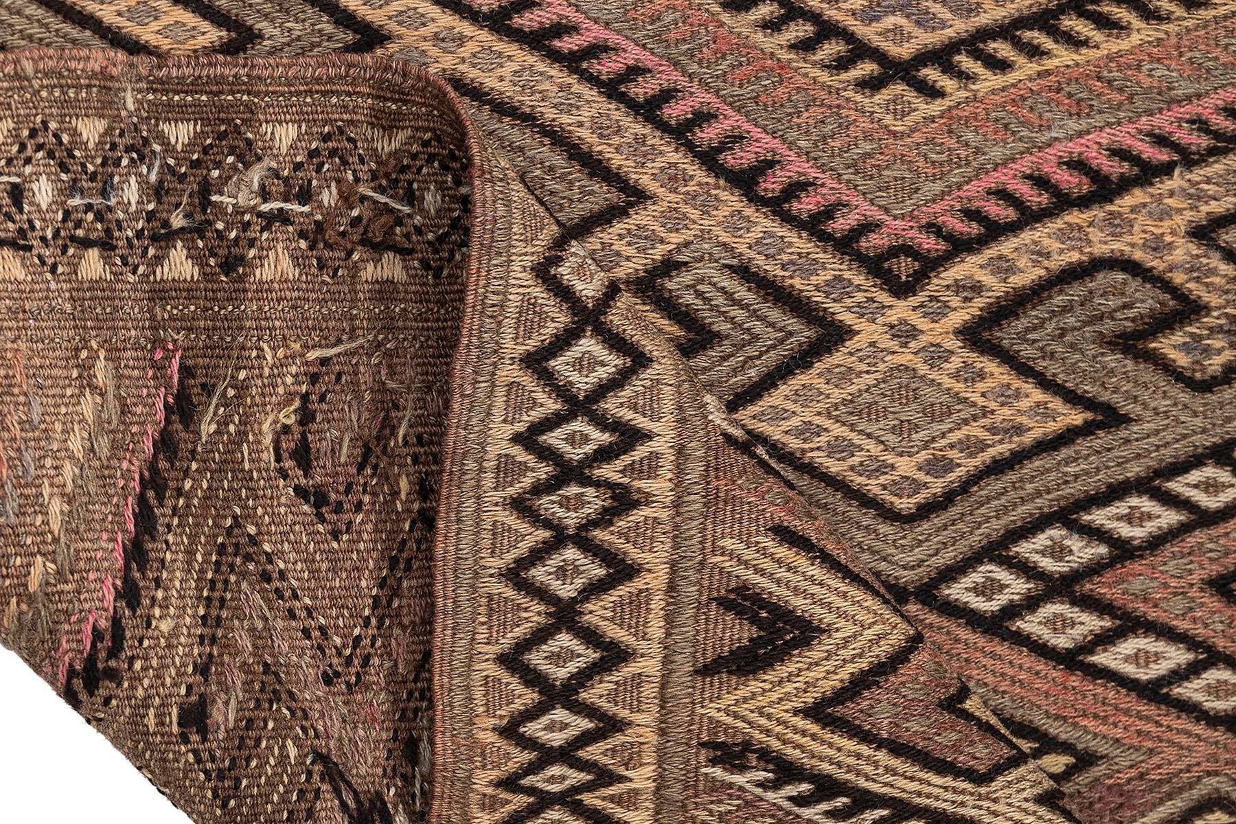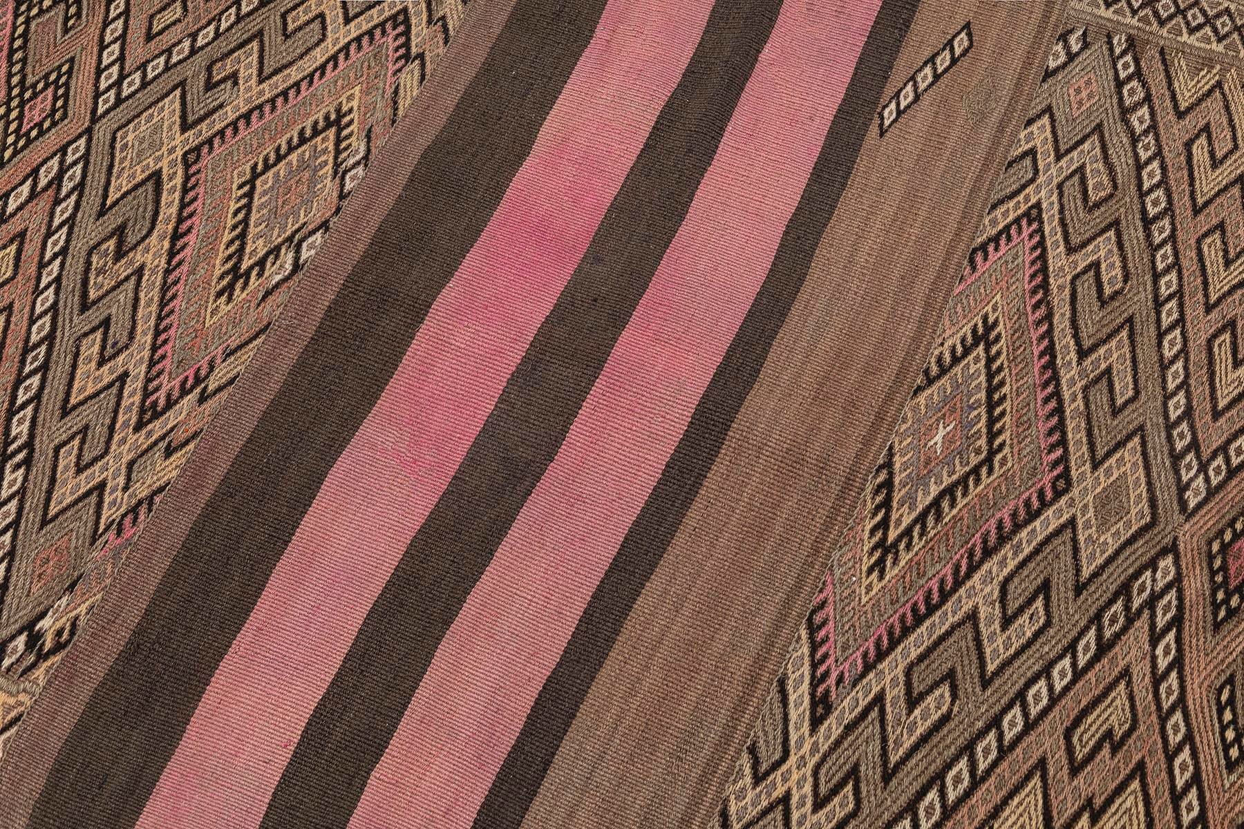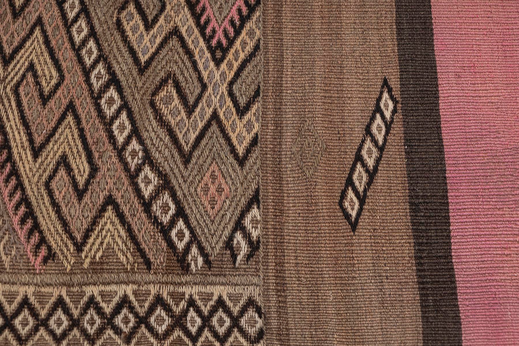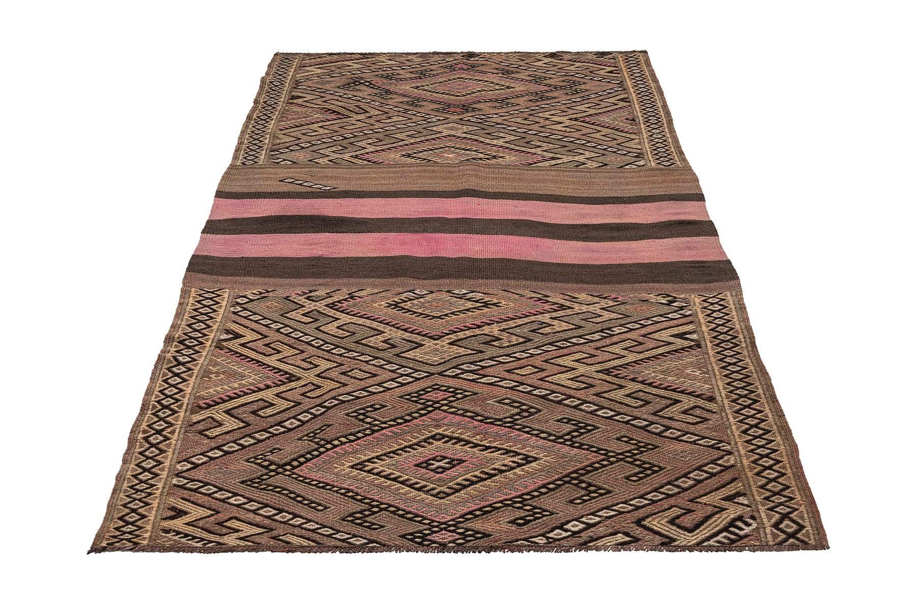 Et karakterfuldt og autentisk kelimtæppe fra Bayburt-regionen i Tyrkiet – vævet i varme jordtoner med smukke rosa og mørke striber, der skaber dybde og ro i rummet.