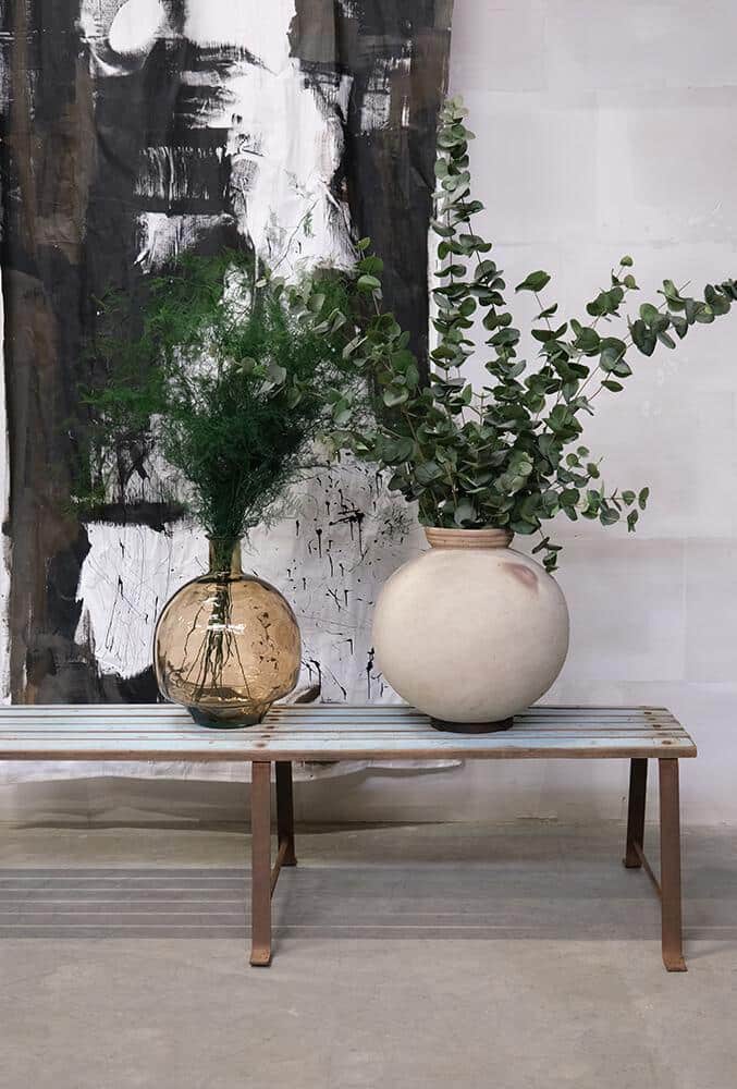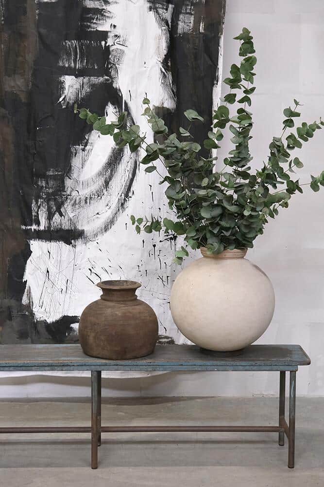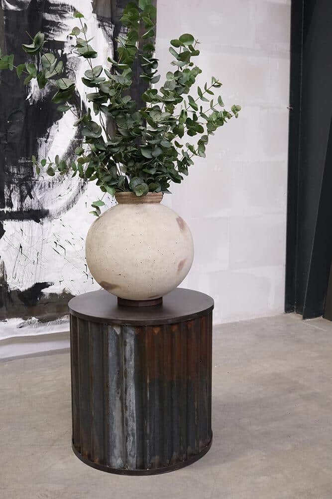 Dette er den største Dali lerkrukke med en højde på 44 cm. Den ru, lyse overflade og den enkle form giver et organisk udtryk, mens jernringen i bunden sørger for stabilitet. Brug den som et dekorativt element eksempelvis med tørrede blomster. Krukken fås i to mindre størrelser – og husk, den tåler ikke frost.