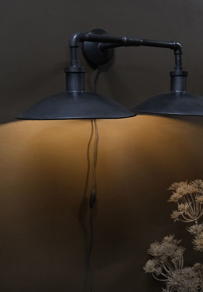Industriel dobbelt væglampe i mørk jern med rørlook og stofledning – hver lampe er unik.