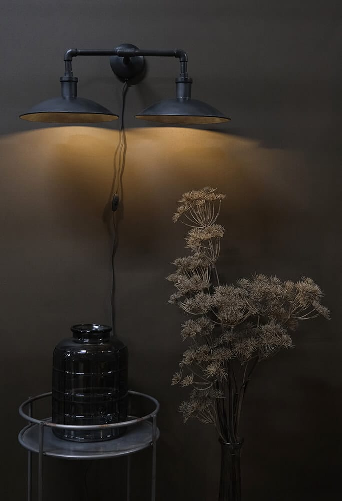 Denne dobbelte væglampe i mørk jernfarve er et stærkt eksempel på industriel charme og funktionelt design. Lampens to metalskærme er monteret på et rør-inspireret stel, som giver et råt og autentisk udtryk med tydelige referencer til klassisk industridesign.