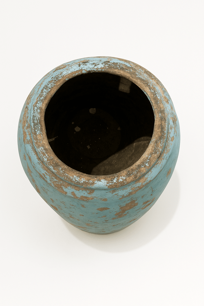 Denne imponerende, håndlavede krukke er et ægte statement piece med masser af karakter og historie. Krukken er udført i kraftigt ler og har en smuk, patineret turkisblå overflade, hvor tidens slid har skabt et unikt spil mellem blå, jordfarvede og sandfarvede nuancer. Ingen to områder er ens – patinaen vidner om alder, brug og håndværk, hvilket gør krukken helt unik.