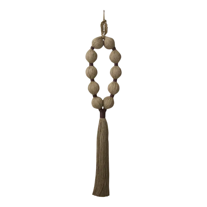 De naturlige jute-materialer kombineret med de mørkerøde detaljer skaber et roligt og balanceret udtryk. Den aflange form gør den velegnet til både små og større vægflader, hvor den kan hænge alene eller indgå som en del af en samlet vægopsætning.