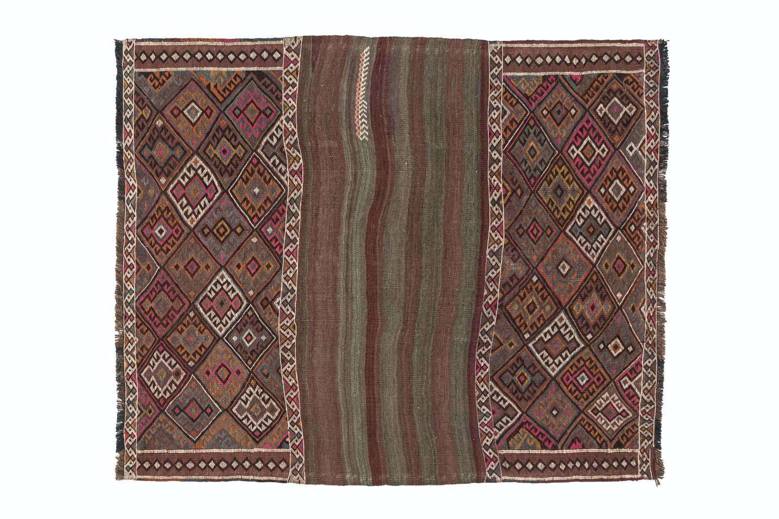 Håndvævet vintage kelim fra Anatolien, Bayburt, ca. 60–70 år gammel. Tæppet har et harmonisk udtryk med klassiske geometriske motiver og varme jordfarver. Et smukt unika-tæppe med ro, balance og karakter.