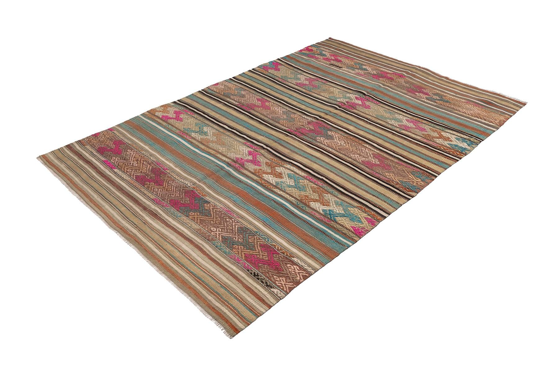 De traditionelle striber og geometriske mønstre er typiske for kelims fra Denizli-regionen i det vestlige Anatolien. De varme jordtoner kombineret med turkis og rosa nuancer giver tæppet et levende, men stadig harmonisk udtryk.